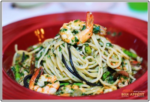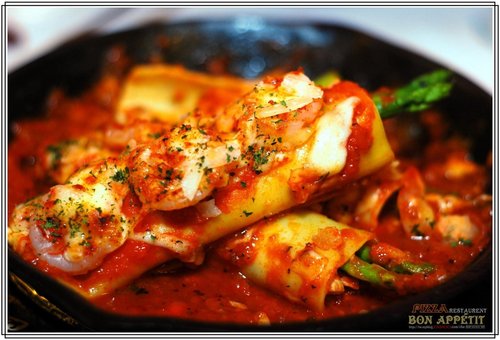 把一般用來做千層麵的麵皮 將雞肉及蘆筍捲起 外面鋪上不吝嗇的蝦仁 酸酸甜甜的蕃茄佐醬 雖然跟我點的時候想像的不一樣 但是還是好吃啦!!