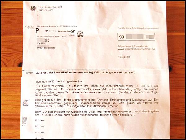 謝謝續恩特地寫信提醒我,他說入籍後他也收到跟我一樣的單子,但是上面的號碼只是在德國的社會號碼,也就是身分證字號。